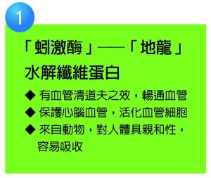 1. 地龍活性蛋白提取物蚓激酶能啟動體內系統直接溶解纖維蛋白, 具有抗凝作用,能幫助溶解新鮮或陳舊性血管垃圾;並能修覆血管內皮細胞和腦神經細胞破損的功能。