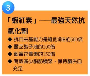 4. 蝦紅素: 天然特強抗氧化食品,從海洋生物提煉,能消除自由基,是維他命E之抗氧化500倍,靈芝孢子油100倍, 藍莓葡萄花青素之150倍,蕃茄紅素之200倍,B-胡蘿卜素的10倍, 達到改善微循環,提升免疫系統功能,以防止腦供血不足導致腦退化。